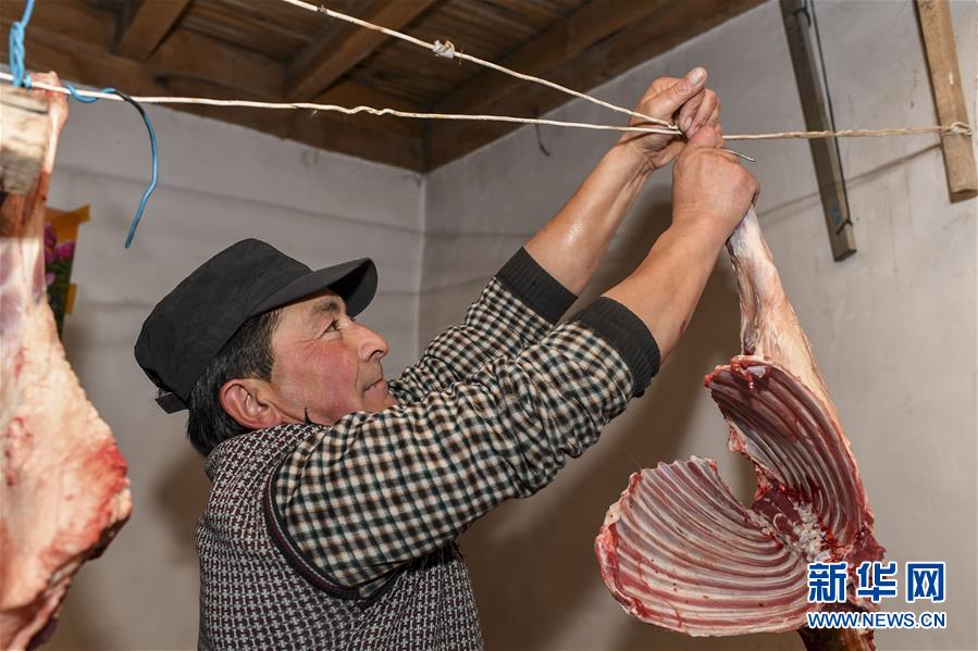 出發(fā)的前一天,都熱·加爾曼把分割好的羊肉掛在家中,這是他特意為暫時留守在家中的妻子和老人準備的(11月16日攝)。新華社記者胡虎虎攝
