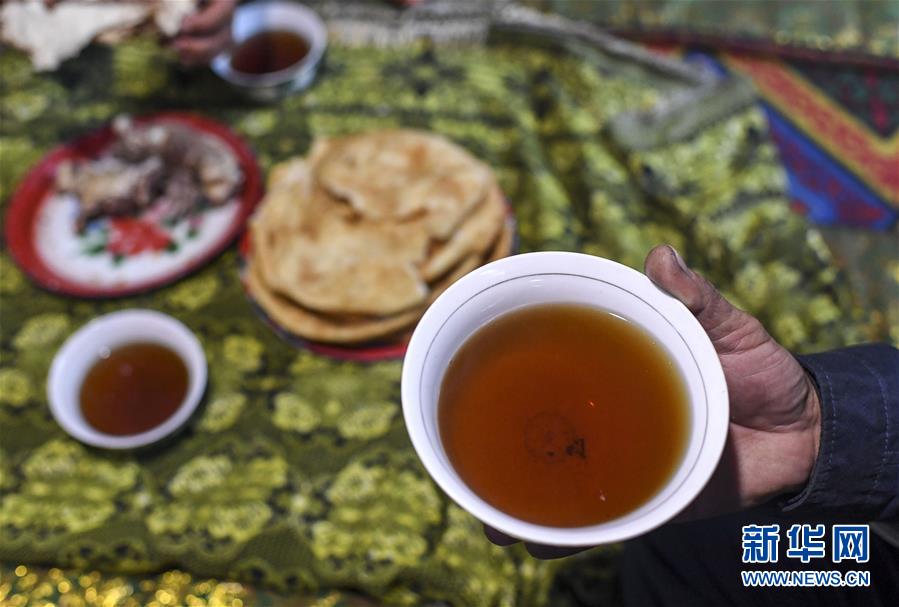 在塔什庫爾干塔吉克自治縣大同鄉(xiāng)阿克托尕欄桿村一組都熱的舊居中,都熱·加爾曼在吃早餐,準備踏上搬遷之路(11月17日攝)。新華社記者胡虎虎攝