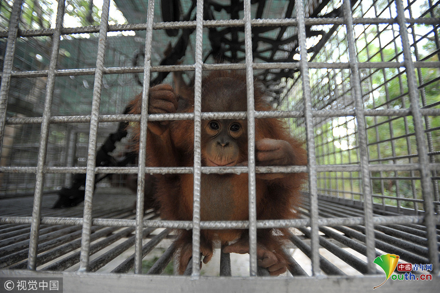 當地時間2018年9月18日,印尼加里曼丹克塔邦,國際動物救援(IAR)猩猩安全與保護中心里,飼養(yǎng)員用獨輪車把猩猩寶寶送到森林學校。圖片作者:Newscom