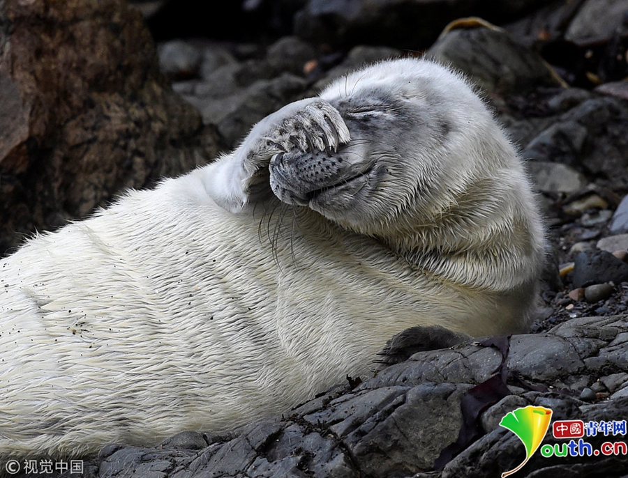 中國青年網(wǎng)北京10月9日電 當?shù)貢r間2018年10月8日,英國彭布羅克郡,一只大西洋海豹幼崽躺在海邊礁石上。海豹幼崽出生時都有毛茸茸的白色非防水皮毛,它們會在第四周蛻皮。