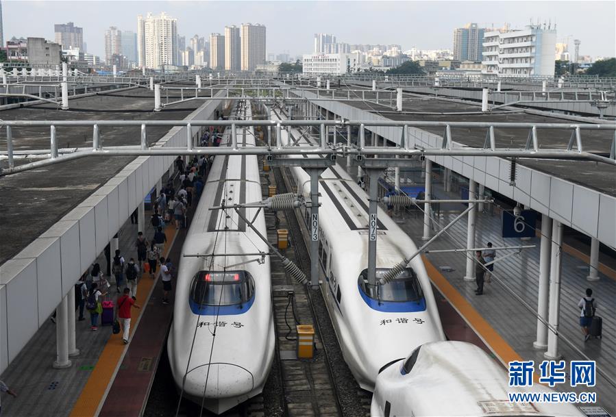 在廣西南寧站,旅客進(jìn)入站臺準(zhǔn)備乘坐動車出行(9月4日攝)。 廣西壯族自治區(qū)成立60年來,鐵路建設(shè)發(fā)生翻天覆地的變化。來自中國鐵路南寧局集團(tuán)有限公司的數(shù)據(jù)顯示,1958年廣西鐵路總里程為1346.3公里,如今廣西鐵路總里程達(dá)5191公里。廣西與周邊相鄰省份間實現(xiàn)動車“公交化”開行。此外,北部灣港—重慶班列、東盟海產(chǎn)品冷鏈班列、“百色一號”果蔬專列等的開通和運營,強(qiáng)化了鐵路供給的針對性和有效性。鐵路成為助推廣西經(jīng)濟(jì)社會快速發(fā)展的“大動脈”。 新華社記者陸波岸攝
