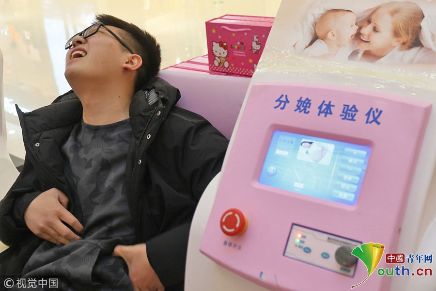 2018年3月8日,一名男士在山東煙臺(tái)大悅城通過“分娩體驗(yàn)儀”感受“分娩”時(shí)的陣痛。