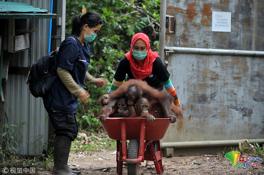 印尼加里曼丹克塔邦,國際動(dòng)物救援(IAR)猩猩安全與保護(hù)中心里,飼養(yǎng)員用獨(dú)輪車把猩猩寶寶送到森林學(xué)校。圖片作者:Newscom