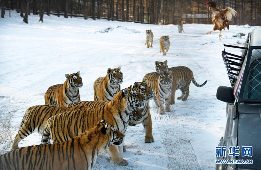 在橫道河子?xùn)|北虎林園散放區(qū),一群東北虎準(zhǔn)備捕食投放的活雞(11月21日攝)。新華社記者王建威攝