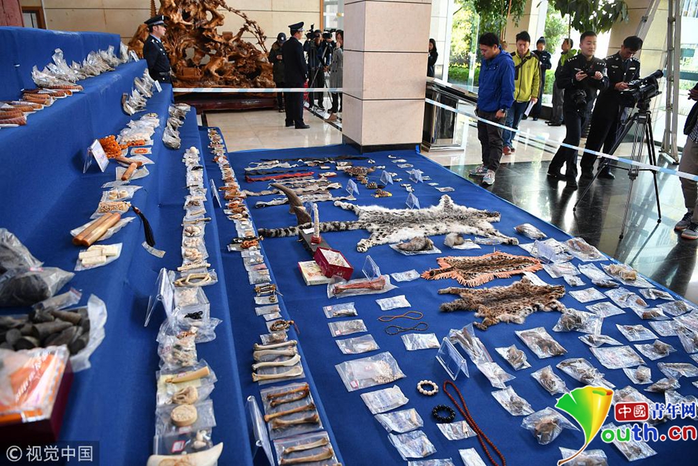 11月23日,現(xiàn)場展示警方查獲的野生動物制品。當日,昆明市森林公安局向媒體通報,破獲一系列特大非法收購出售珍貴瀕危野生動物及其制品案件。