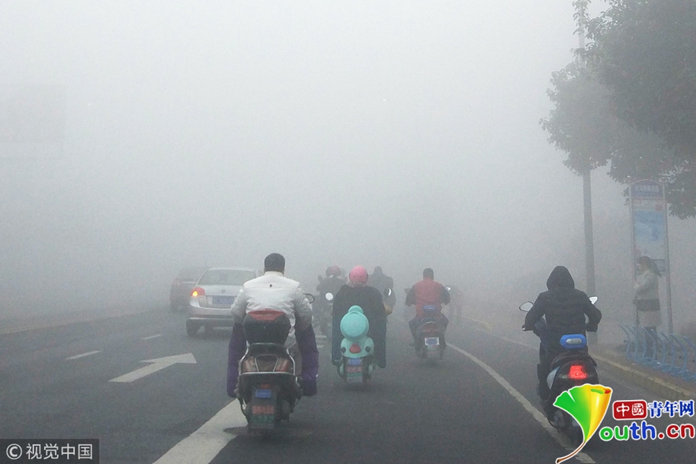 全國(guó)多地出現(xiàn)大霧天氣 市民霧中穿行
