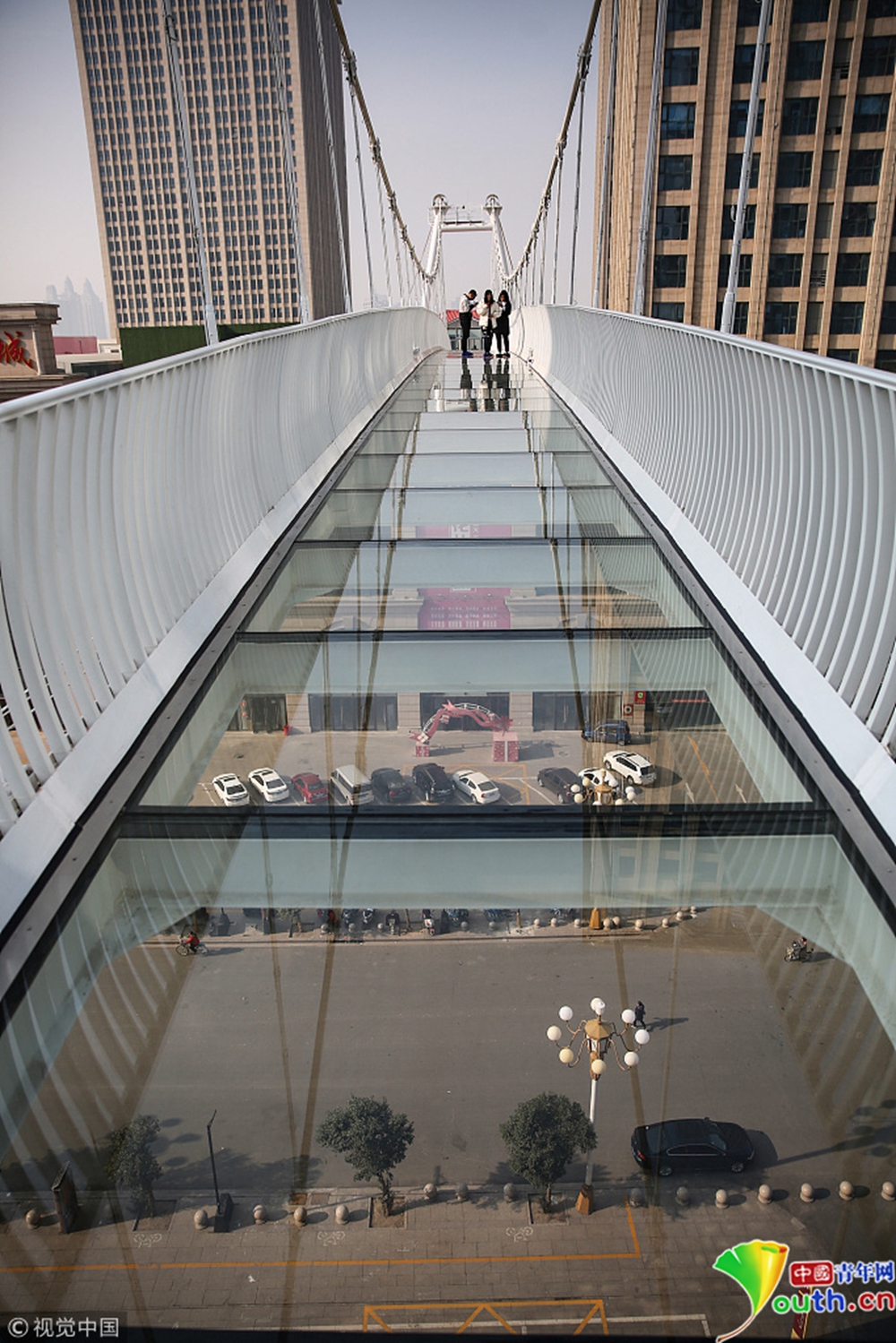 玻璃吊橋被三座高層寫字樓所環(huán)繞,緊鄰石家莊火車站和南二環(huán)高架橋,車流、人流密集。