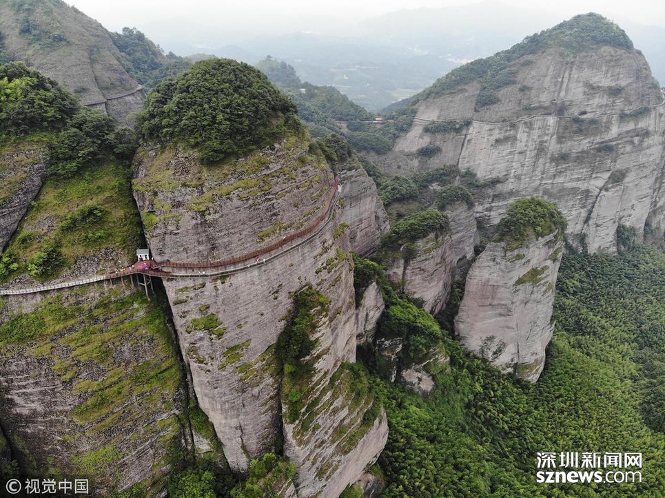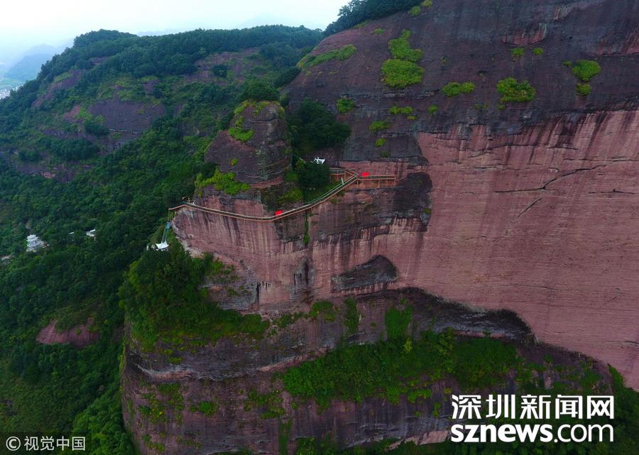 深圳新聞網訊 2018年6月19日,航拍江西贛州南武當山百米高空玻璃棧道。棧道緊貼峭壁,在懸崖之上凌空蜿蜒穿行,猶如一條玉龍盤旋在綠林石海之中。 南武當山位于江西最南端的龍南縣武當鎮(zhèn)境內,景區(qū)核心面積達到13.5平方公里,擁有99座千姿百態(tài)的巍峨石峰,丹霞地質風貌突出,連綿十里,被稱為“武當十里畫廊”。