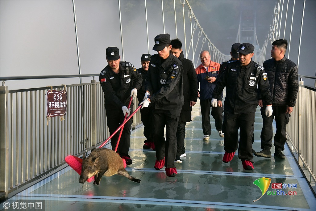 2018年11月29日,一只山豬誤入廣東清遠古龍峽云天玻霸玻璃橋,結(jié)果被嚇得趴在橋面上發(fā)抖,幾名值班保安齊心協(xié)力將山豬從玻璃橋上解救出來,將其送回森林。