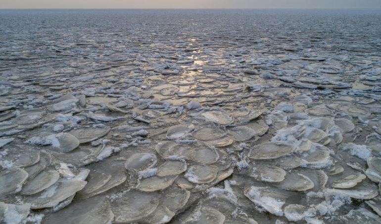 航拍中俄界湖興凱湖封凍 如同浪花被 ...