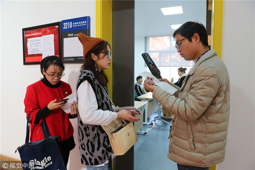2018年12月02日,江蘇省南京市,考生在南京林業(yè)大學(xué)考點(diǎn)看考場(chǎng)分布。姚家/視覺中國(guó)