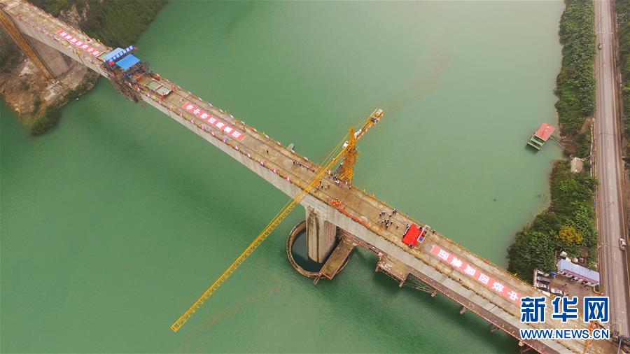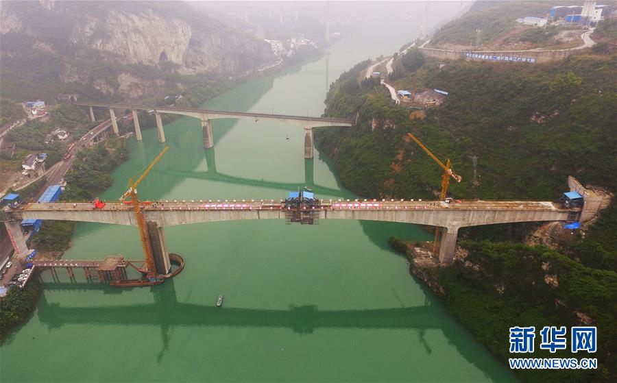 10月23日,在重慶涪陵,施工人員在渝懷鐵路涪秀二線重點工程——烏江右線大橋主跨合龍現(xiàn)場作業(yè)。 當日,由中鐵四局承建的渝懷鐵路涪秀二線重點工程——烏江右線大橋主跨成功合龍,標志著大橋主體工程全部順利結(jié)束。烏江右線大橋項目全程460.1米,主跨192米,跨越烏江和319國道。在兩年多的建設(shè)過程中,施工人員攻克了“不等高墩”“不對稱邊跨”“邊跨入隧”等多個技術(shù)難題。 新華社記者王全超攝