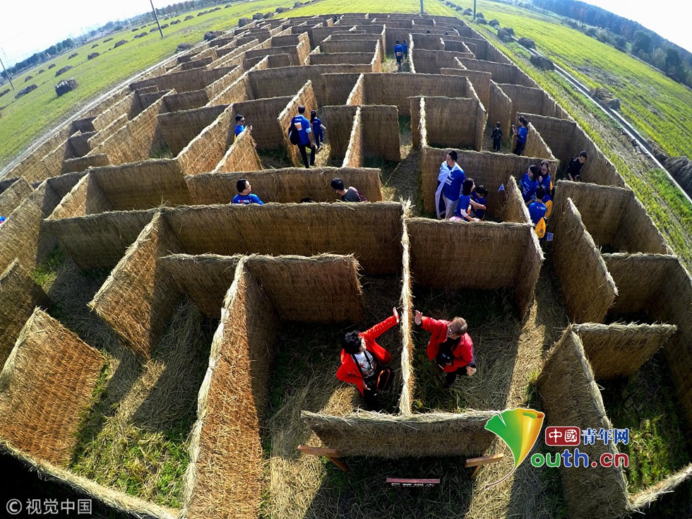 其中還有一個(gè)占地一畝多的稻田迷宮,游人穿梭在秸稈做成的迷宮里,別有一番獨(dú)特質(zhì)樸的樂(lè)趣。圖片來(lái)源視覺(jué)中國(guó)