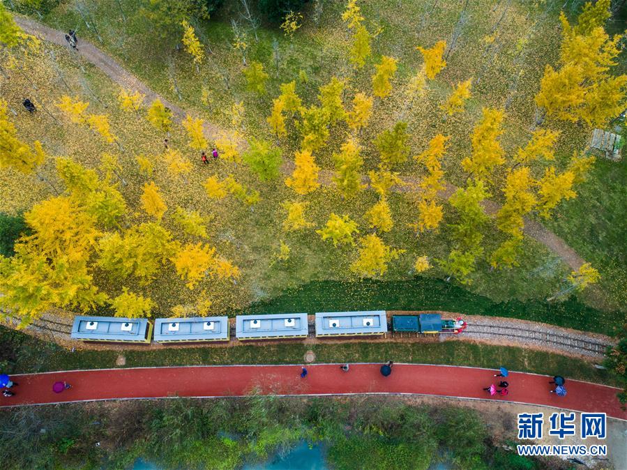 一列觀光小火車帶著游客穿行在銀杏林里(11月16日無人機(jī)拍攝)。近日,在浙江省長興縣小浦鎮(zhèn),“十里銀杏長廊”和近千畝花海經(jīng)過近一年的升級(jí)改造后,以嶄新的面貌與游客見面?;ê?、觀光小火車、古村民宿、銀杏長廊等旅游項(xiàng)目全面提升了小浦鎮(zhèn)鄉(xiāng)村旅游的品質(zhì)。新華社記者 徐昱 攝