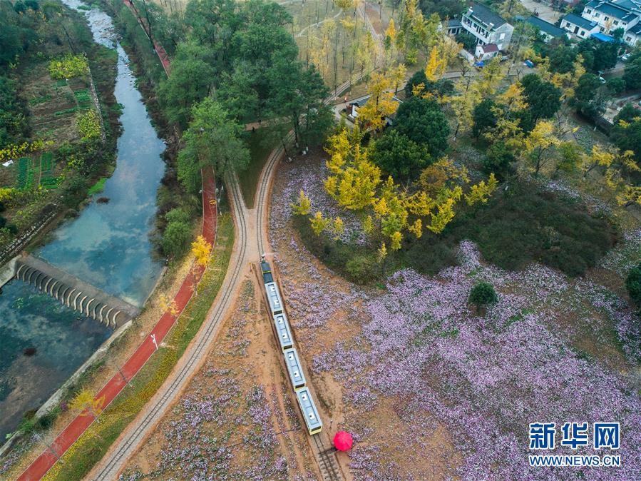 一列觀光小火車帶著游客穿行在銀杏林和花海之間(11月16日無人機(jī)拍攝)。近日,在浙江省長興縣小浦鎮(zhèn),“十里銀杏長廊”和近千畝花海經(jīng)過近一年的升級(jí)改造后,以嶄新的面貌與游客見面。花海、觀光小火車、古村民宿、銀杏長廊等旅游項(xiàng)目全面提升了小浦鎮(zhèn)鄉(xiāng)村旅游的品質(zhì)。新華社記者 徐昱 攝