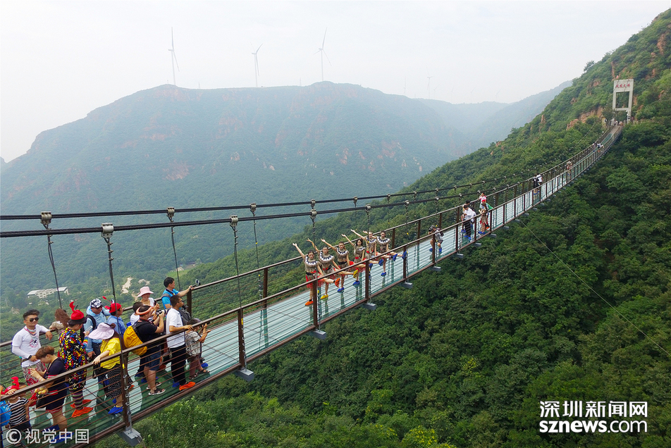 這座玻璃吊橋位于石家莊南二環(huán)附近,橋體橫跨塔通大街,長100米,高30米,。橋面由52塊特質(zhì)玻璃構(gòu)成,其中4塊為特效玻璃,游客腳踩上去就會發(fā)出玻璃破裂的聲音。