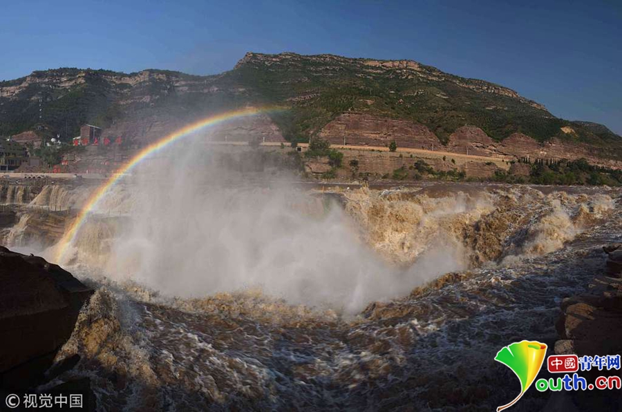 5月31日,山西臨汾奔騰咆哮的黃河壺口瀑布吸引游客。近日,受上游地區(qū)降雨量增多影響,黃河干流晉陜峽谷水量大增,每秒流量達(dá)到1100立方,是常年同期的三倍,壺口瀑布出現(xiàn)五月份罕見的瀑布群景觀,吸引了眾多游客。