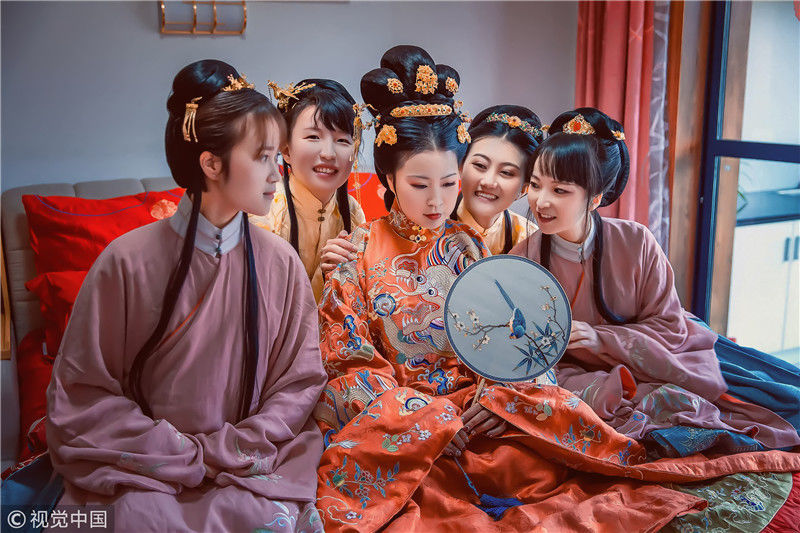 婚禮現(xiàn)場(chǎng)布置小橋流水,擺滿桃花樹,樹上桃花朵朵,競相開放。女孩非常追求婚禮的隆重氣氛,專門搭建了一座矮橋,飄落的花瓣靜躺水面,充滿詩情畫意。圖為婚禮現(xiàn)場(chǎng),新娘和伴娘。