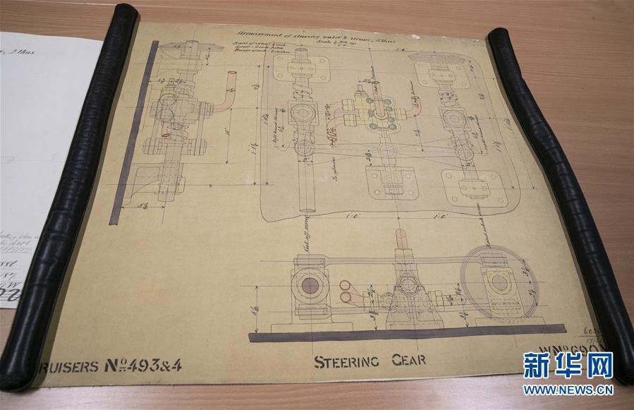 這是11月2日在英國紐卡斯爾的泰恩—威爾檔案館拍攝的致遠艦設(shè)計圖紙。 新華社記者日前在紐卡斯爾泰恩—威爾檔案館查找北洋海軍史料時發(fā)現(xiàn)一套七張、檔案名為“中國巡洋艦舵機設(shè)計圖”的原始圖紙。塵封百年,甲午海戰(zhàn)中抗擊日艦后沉沒的清北洋海軍致遠艦部分原廠設(shè)計圖紙在其建造地——英國紐卡斯爾市的一家檔案館首次被發(fā)現(xiàn),為打撈那段悲壯的歷史提供了重要參考。 新華社記者 韓巖 攝