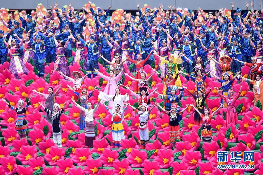 12月10日,廣西壯族自治區(qū)成立60周年慶祝大會在廣西體育中心隆重舉行。這是慶祝大會上的群眾文藝表演。 新華社記者 申宏 攝