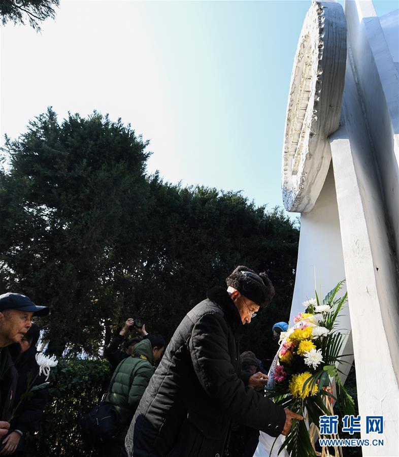 12月12日,來自湖南的抗戰(zhàn)老兵李湘炳(前)等在侵華日軍南京大屠殺中山碼頭遇難同胞紀(jì)念碑前祭奠遇難同胞。 當(dāng)日,來自湖南、江蘇等地的4名抗戰(zhàn)老兵以及志愿者、南京當(dāng)?shù)卮髮W(xué)生代表等來到侵華日軍南京大屠殺中山碼頭遇難同胞紀(jì)念碑前獻(xiàn)花、默哀,祭奠遇難同胞。 新華社記者 季春鵬 攝