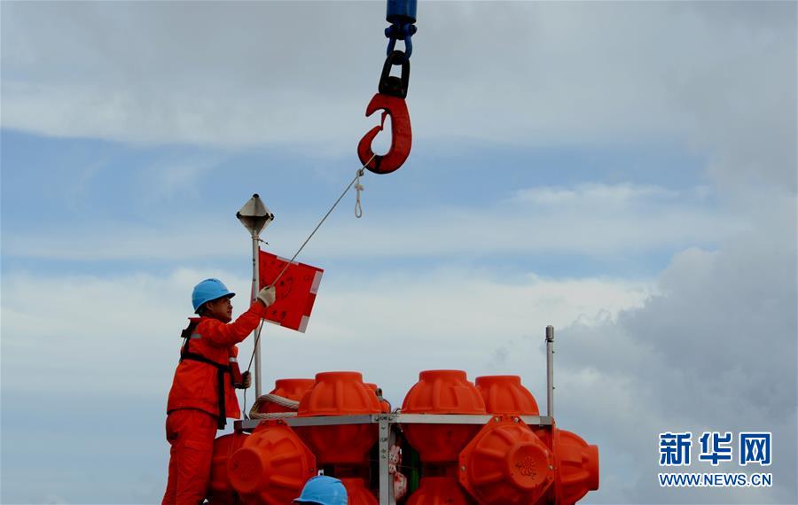 考察隊員對“彩虹魚”著陸器進(jìn)行掛鉤作業(yè)(12月10日攝)。 由上海海洋大學(xué)和西湖大學(xué)聯(lián)合組成的“彩虹魚”科考團(tuán)隊,12月11日在全球最深的海溝——馬里亞納海溝成功完成兩臺“彩虹魚”第二代著陸器的萬米級海試,深度分別為10918米和10899米。 新華社記者 張建松 攝