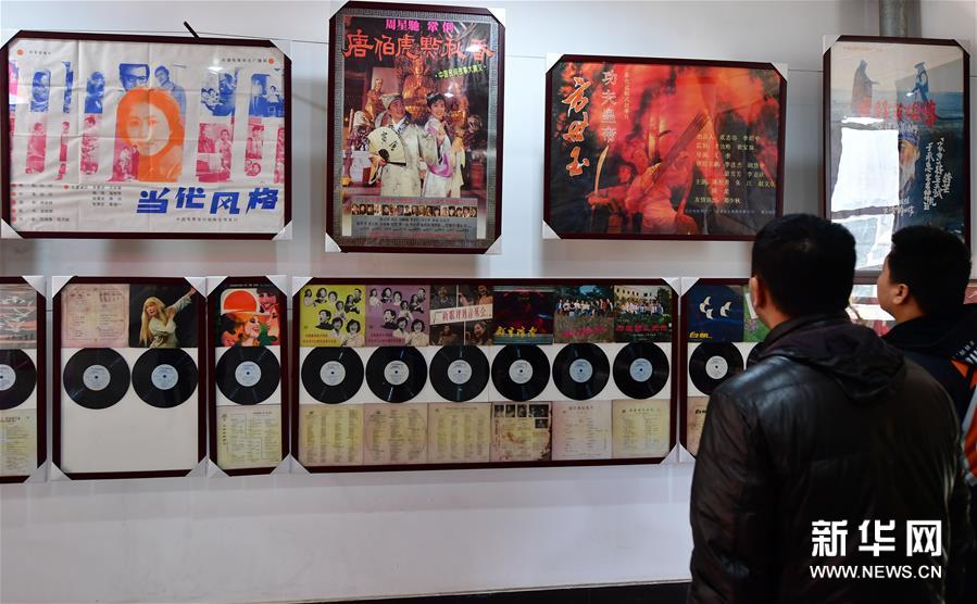 12月12日,觀眾在洛陽隋唐百戲城觀看展出的電影海報(bào)與老唱片。新華社記者馮大鵬攝