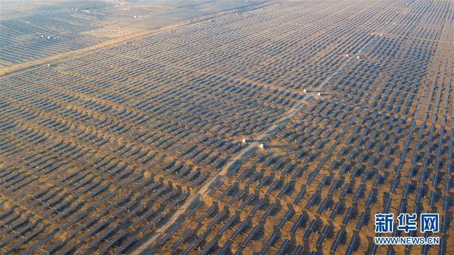 位于庫布其沙漠腹地的達(dá)拉特光伏發(fā)電應(yīng)用領(lǐng)跑基地一期500兆瓦項(xiàng)目(12月13日無人機(jī)拍攝)。 新華社記者 彭源攝