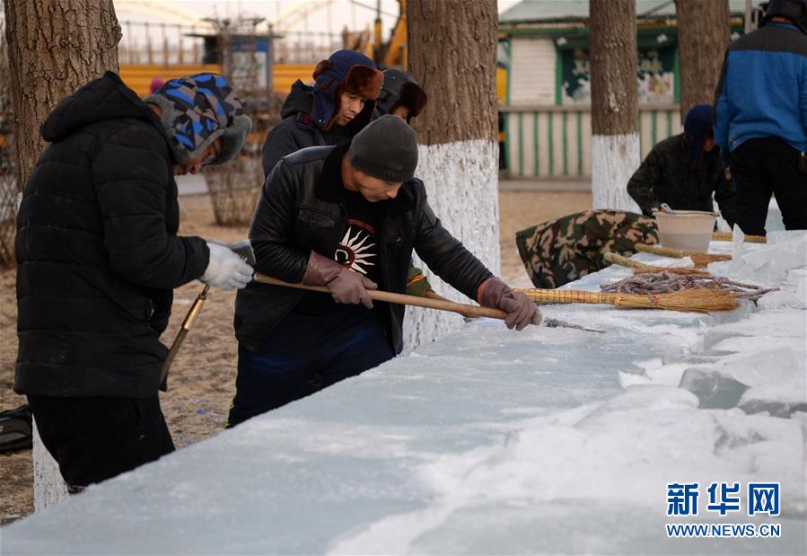 12月17日,冰雕師在松花江畔制作冰雕景觀。新華社記者王凱攝