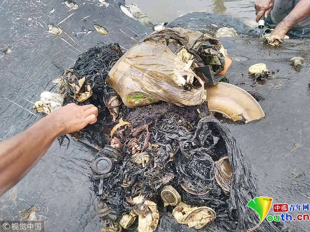 當(dāng)?shù)貢r間2018年11月19日,印尼瓦卡托比,當(dāng)?shù)匕l(fā)現(xiàn)一頭擱淺的鯨,肚子里滿是塑料垃圾。它的腹中有12斤塑料垃圾,其中包括115個杯子。