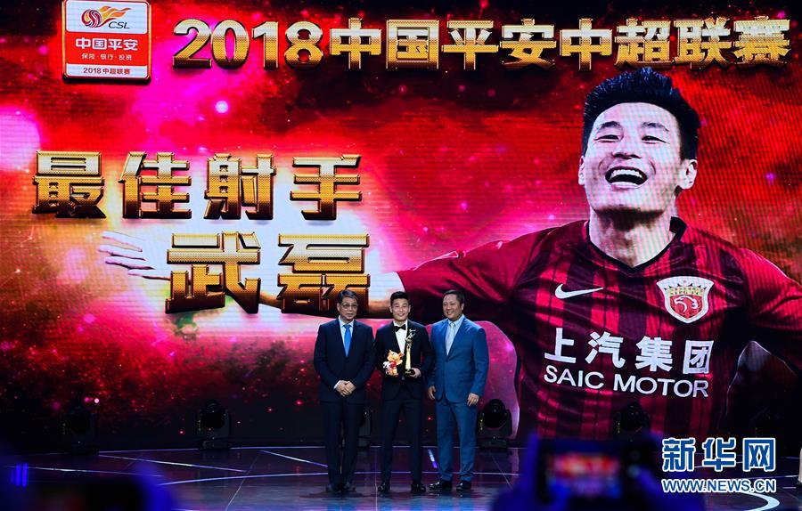 圖為2018年11月21日,獲最佳射手獎的上海上港隊球員武磊(中)在2018中國平安中超聯(lián)賽頒獎典禮上的資料照片。 新華社記者楊冠宇攝