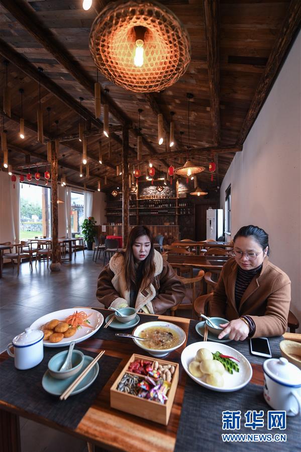 12月19日,民宿“僻地寒樓”的主人張雁(右)和媽媽在制作特色美食。該民宿共有7幢風(fēng)格各異的小屋分布在山坡上,頗具特色。河橋鎮(zhèn)青年張雁辭去了上海的工作,回到家鄉(xiāng)開(kāi)辦了這家民宿。 新華社記者 徐昱 攝