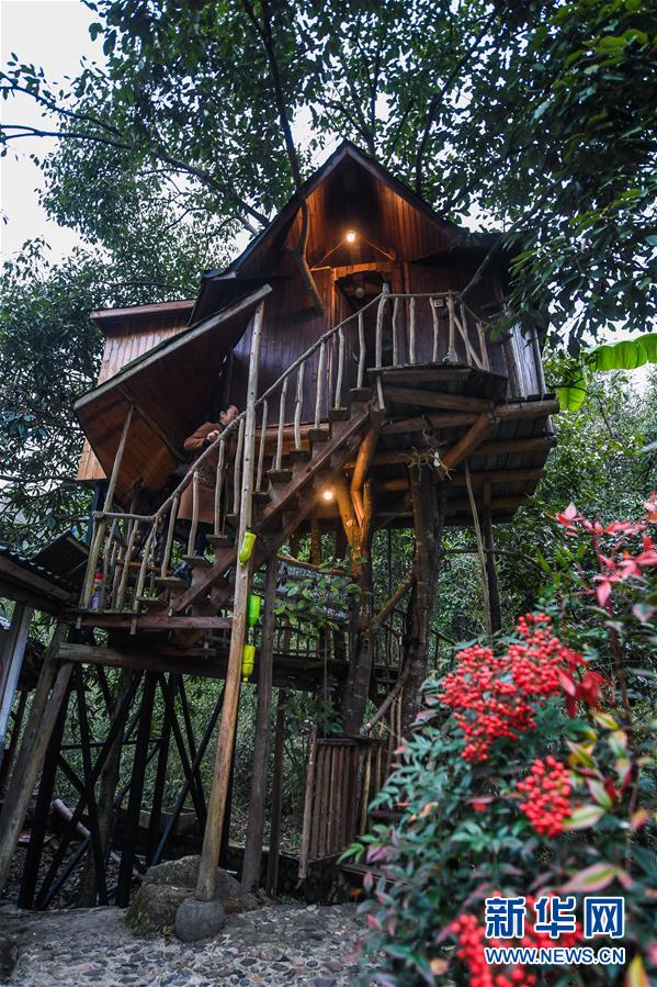這是民宿“僻地寒樓”的一間樹(shù)屋(12月19日攝)。該民宿共有7幢風(fēng)格各異的小屋分布在山坡上,頗具特色。河橋鎮(zhèn)青年張雁辭去了上海的工作,回到家鄉(xiāng)開(kāi)辦了這家民宿。 新華社記者 徐昱 攝