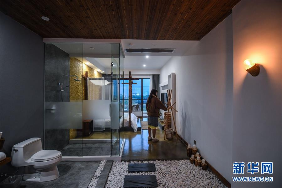 12月19日,章淑貞在民宿“初憶小院”房間內(nèi)整理內(nèi)飾。該民宿是河橋鎮(zhèn)“90后”女孩章淑貞開(kāi)辦的,民宿融入了大量的現(xiàn)代建筑設(shè)計(jì)風(fēng)格,深受年輕人的喜愛(ài)。 新華社記者 徐昱 攝