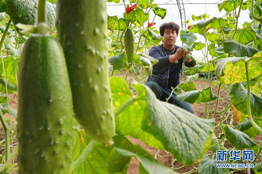 12月20日,唐山市豐潤區(qū)百草坡農(nóng)產(chǎn)品農(nóng)民專業(yè)合作社社員在大棚內(nèi)管護(hù)黃瓜。