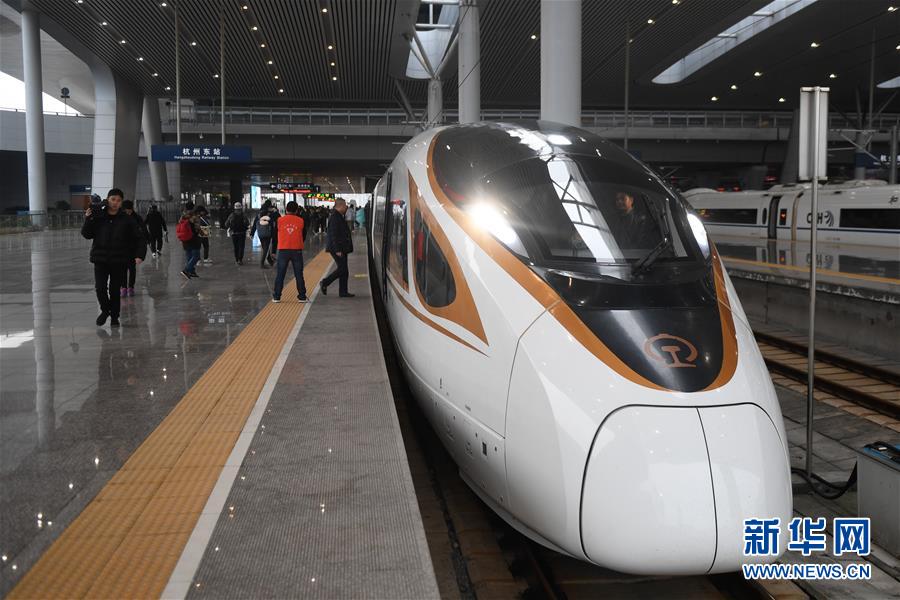 ↑12月25日,杭黃高鐵D9551次首發(fā)列車即將從杭州東站駛出。新華社記者黃宗治攝