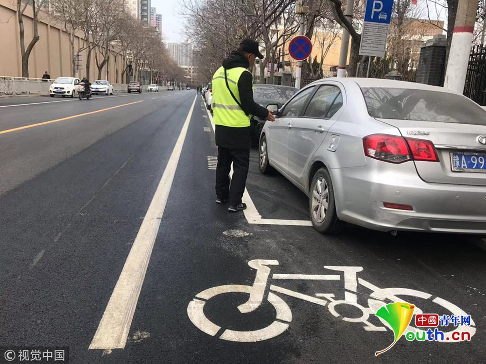 “你看看,自行車道被新劃的停車位占住了,路邊沒有停車還好,一旦有汽車,我騎車只能走快車道,基本沒有騎車的位置了。”市民張先生說,“這里最多能容下一輛電動車通行,不走機(jī)動車道你說走哪?”