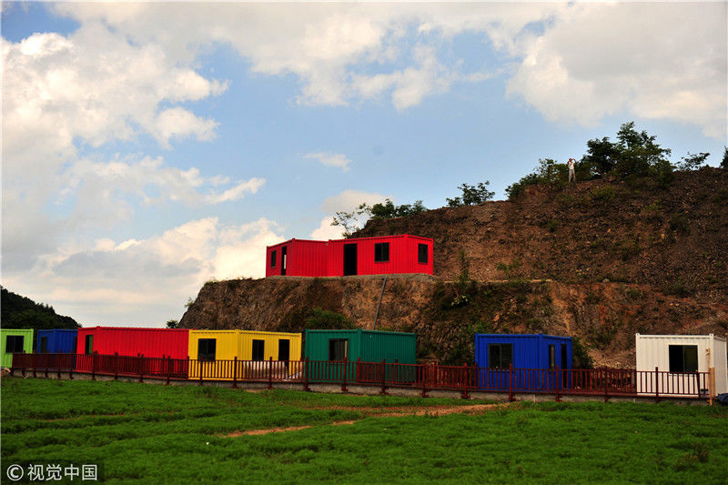 2018年6月9日,湖北省宜昌市夷陵區(qū)樟村坪鎮(zhèn)羊角山村“云上西寨”康養(yǎng)綠地正在建設(shè)的“集裝箱”民俗項(xiàng)目區(qū)風(fēng)景。張國(guó)榮/視覺中國(guó)