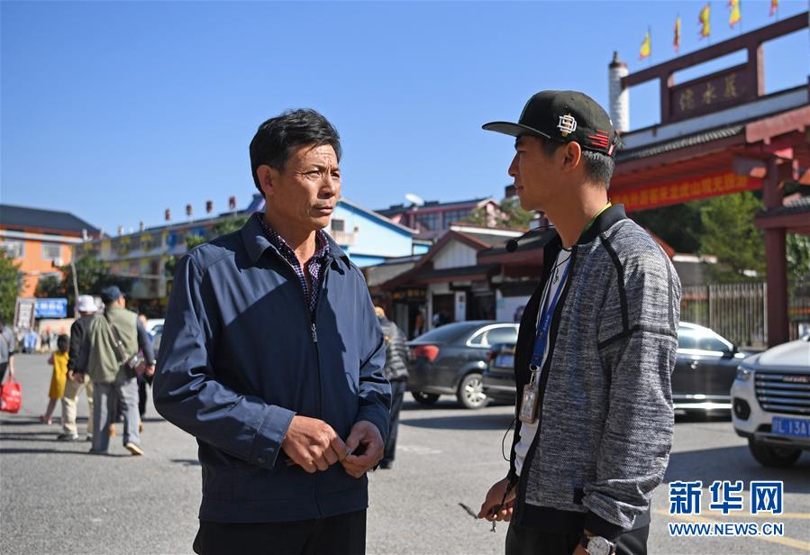 在龍虎山景區(qū)門口,舒港發(fā)囑咐做導(dǎo)游的小兒子舒志剛注意游客的安全(10月28日攝)。