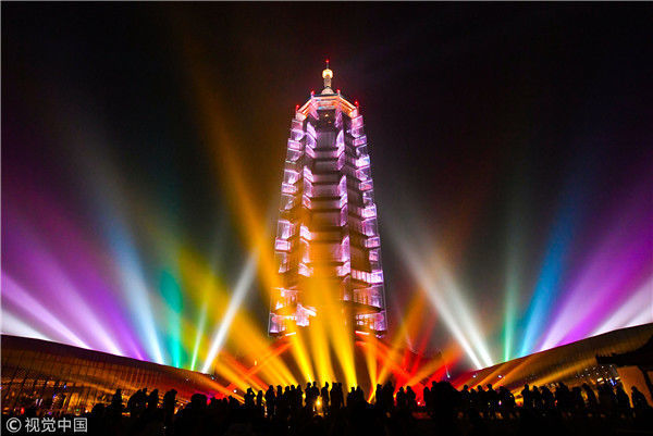2017年12月31日跨年夜,南京,大報(bào)恩寺遺址公園內(nèi)的大報(bào)恩塔塔身投影出“你好2018”的字樣,眾多市民前來撞鐘,為家人和朋友祈福,迎接新年。