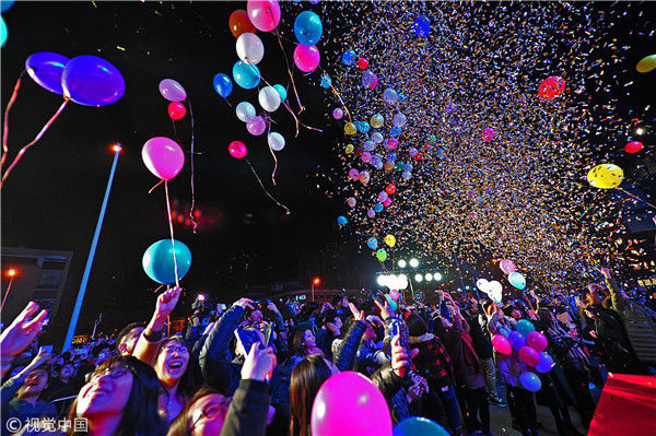 2017年12月31日,天津大悅城,市民們放飛氣球,迎接2018的到來(lái)。