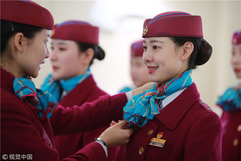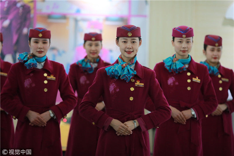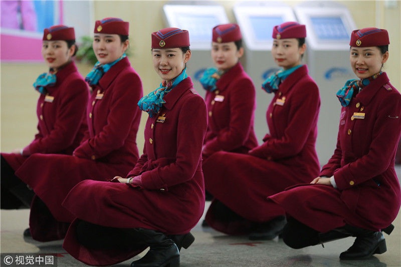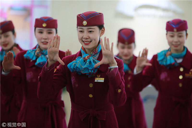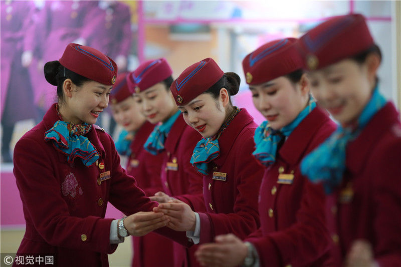 2018年12月27日,四川成都,為備戰(zhàn)即將開通的成雅鐵路,中國鐵路成都局集團有限公司成都客運段動車二隊對成雅動車的乘務(wù)人員進行理論、形體、服務(wù)禮儀等內(nèi)容的培訓(xùn)。蘇志剛/視覺中國
