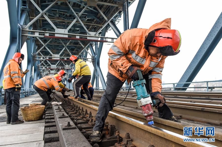 線路工劉非(右一)在南京長江大橋鐵路橋進行木枕改道作業(yè)(12月27日攝)。