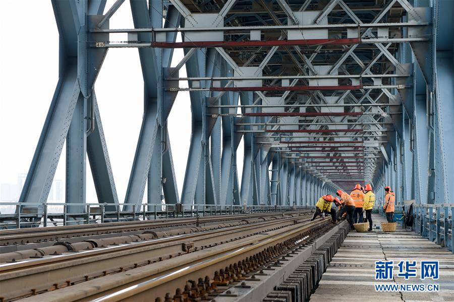 線路工們?cè)谀暇╅L江大橋鐵路橋進(jìn)行木枕改道作業(yè)(12月27日攝)。