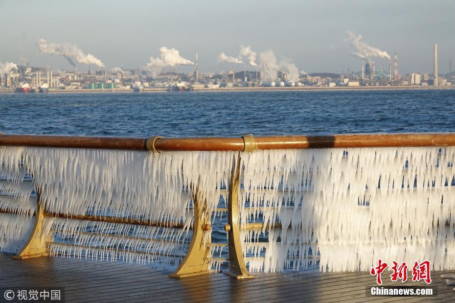 隨著北方持續(xù)低溫,渤海大連海域的海水在潮汐和大風(fēng)的作用下涌上岸邊,在護(hù)欄上凝結(jié)成大面積的冰凌景觀。