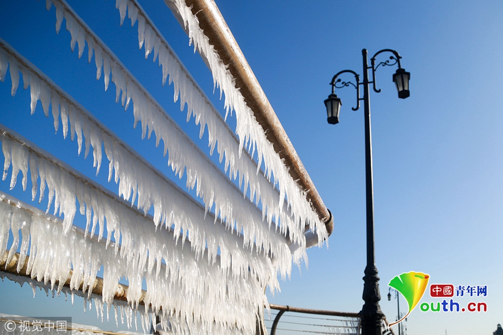2018年12月29日,大連,晶瑩剔透的冰凌錯(cuò)落有致的懸掛在東港海岸的木棧道護(hù)欄上,美輪美奐,形成了一道“風(fēng)雕冰琢”的風(fēng)景。