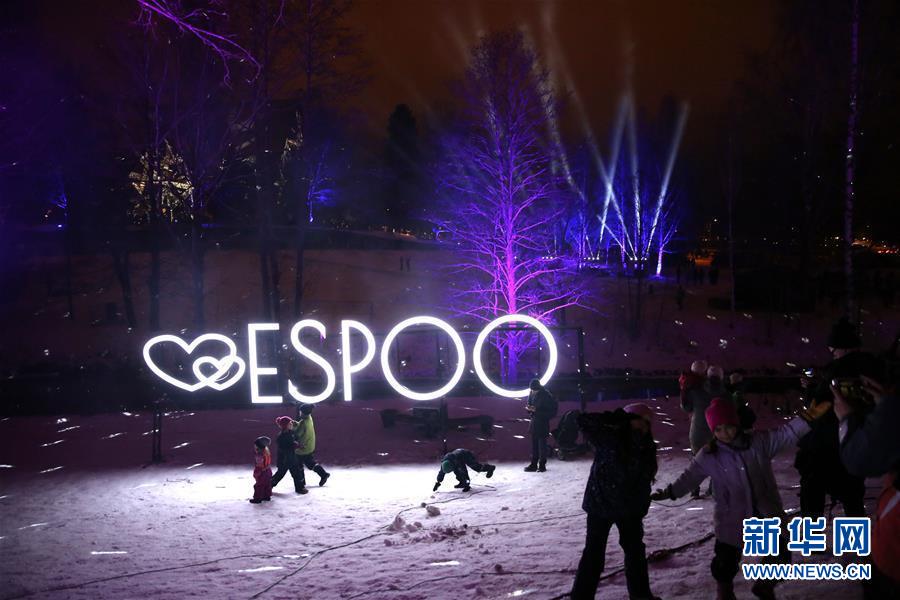2018年12月31日,在芬蘭南部城市埃斯波,人們在燈光點(diǎn)綴的公園內(nèi)玩耍。