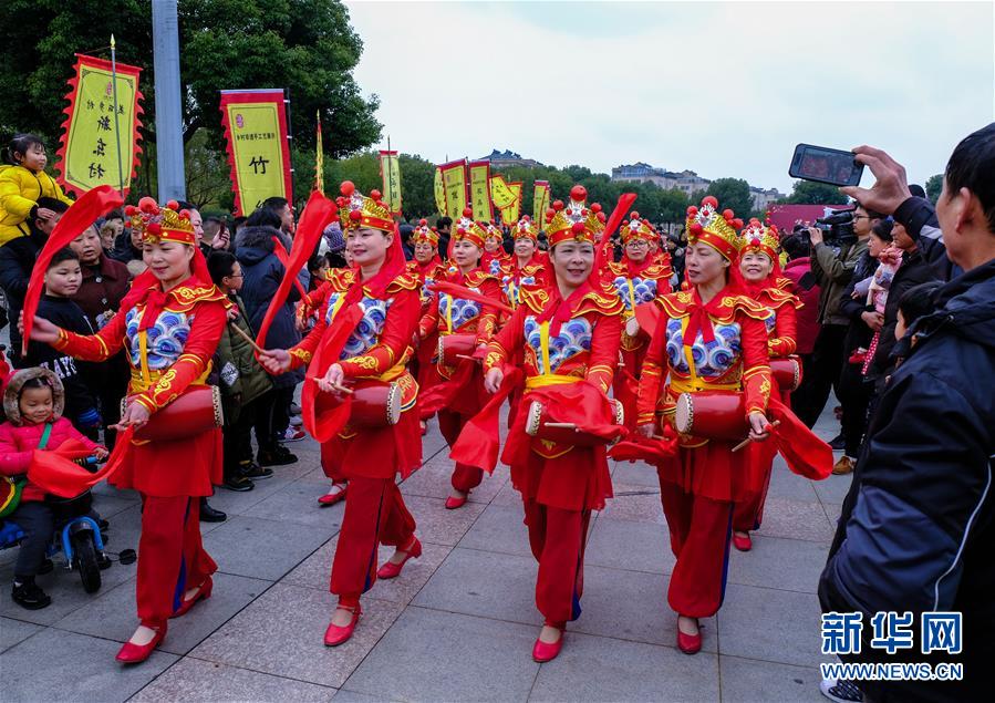 2019年1月1日,演員在展演活動上進行腰鼓表演。2019年元旦,浙江省桐鄉(xiāng)市濮院鎮(zhèn)舉辦新年“非遺文化藝術(shù)節(jié)”活動,濮院鎮(zhèn)下屬多個鄉(xiāng)村的傳統(tǒng)美食制作、手工藝品、非遺文化表演等鄉(xiāng)村特色非遺項目在濮院鎮(zhèn)中心廣場進行集中展示展演。新華社記者 徐昱 攝