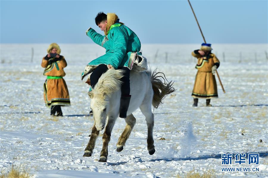 1月8日,牧民在馴服一匹烈馬。 時下正值草原冬季旅游旺季,內蒙古自治區(qū)西烏珠穆沁旗的牧民們在雪原上一展身手,為游客展現獨特的民族風情。 新華社記者 鄒予 攝