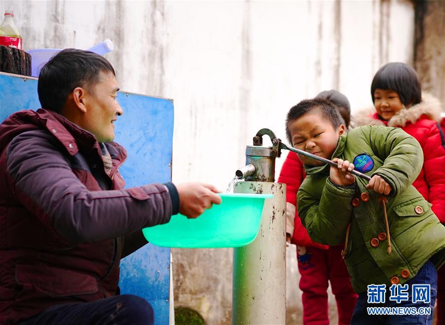1月3日,黃泥小學(xué)的學(xué)生(左二)在學(xué)校的一口井邊幫章站亮打取洗菜所用的水。 新華社記者 胡晨歡 攝